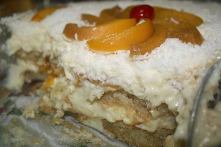 Cubra com o creme reservado e em seguida espalhe os pêssegos picados.
